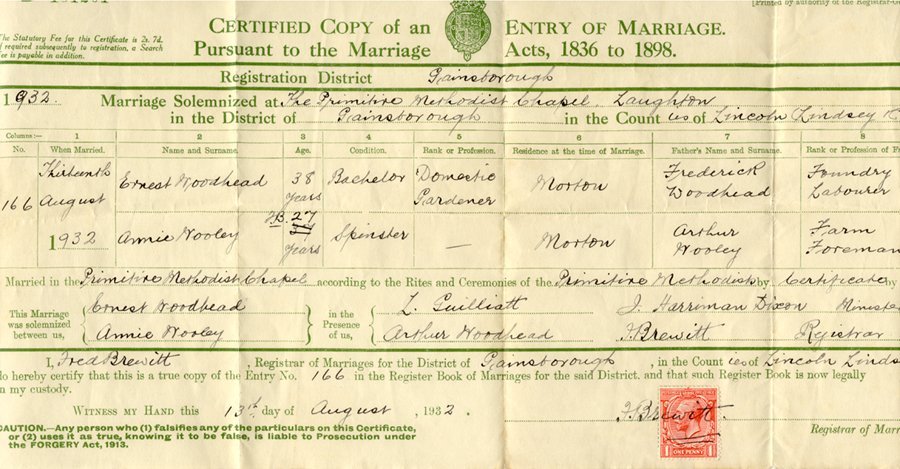 | Married | Ernest WOODHEAD The Primitive Methodist Chapel, Laughton, Gainsborough, Lincolnshire Witnesses: Arthur WOODHEAD and L. GUILLIATT |